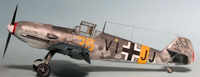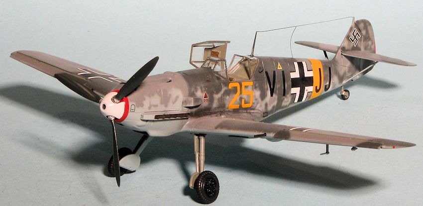 Where the 109 became truly well known was during the Battle of Britain, where it was pitted against the Hurricanes and Spitfires of the RAF. Here the short range of the 109 was to prove a deficit to those 109 pilots whose job it was to protect German bombers. It was also here that the 109E version was truly blooded, having missed out in most of the action during the Spanish Civil War. The range situation was taken care of very late in the Battle of Britain with the introduction of the 109E-7 version. This was plumbed to carry a drop tank, something that would have been a lot more useful earlier in the year. This equipment was later retrofitted to many earlier versions.