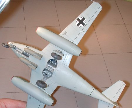 Like so many kits, I was really undecided about the camo scheme until it was time to start painting. Searching through the many aftermarket decal sheets that I have for the 262 (actually about three of them), none seemed to offer anything for the early Jabo 262 except for one and it was a rather boring scheme. This left the kit markings. Well, all of them will have RLM 76 undersides so I painted the underside of the kit with my dwindling supply of Aeromaster enamels. After masking the tail planes, I decided to do White Y, the third scheme in the kit. This has RLM 82/83 upper surfaces with the fuselage and engines covered in a dense squiggle of RLM 82, the darker of the two colors.