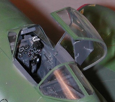 Next order of business was to do some detail painting in the cockpit and to start adding parts. I used the kit decals for the instrument panel and the fit was superb. Just a touch of Champ setting solution got them to snuggle right down. The instrument faces on the plastic panel are otherwise blank. With the cockpit properly painted, it was glued into the right fuselage half.