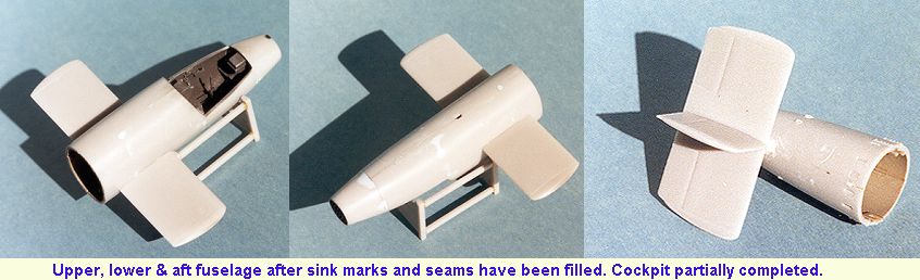 The rear fuselage was the next part to get attention. The interior is listed as being painted in RLM 79, a sandy brown. Undoubtedly this is used to simulate wood. I got out my wood paint and wide brush for this section. After it dried the center tabs used to glue the aft section to the cockpit section were removed otherwise the aft fuselage would not fit over the cockpit section when the engine was installed. After looking at the horrible paint job, I overpainted it with RLM 02 grey. Maybe not accurate, so sue me!! The aft sections were then glued together. At this time both the fore and aft sections had seams and sink marks filled. There really were quite a number of them on the nose section.