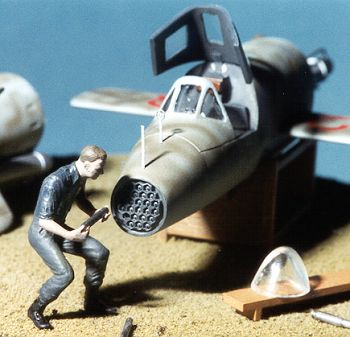 Once the kit was painted, the final etched bits were added, as well as the canopy, and then some thin solder was used to represent some lines shown on the box top. It was placed on the base that came with the kit. The base had some 'grass' from Woodland Scenics glued onto it to add some color to it. The figures then had a hole drilled in one heel and some wire inserted. Holes were then in the base and the figures placed in a manner similar to what is on the box top.