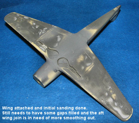 It was now time to attach the wings. I lined things up as carefully as I could and then just tacked the front and rear in place on the fuselage. After a bit more fiddling, I added more super glue to hold the wing in place. When all was dry, I sanded the join areas . A few areas will need some additional filler and there is a step at the rear wing fuselage join that I wasn't able to totally remove. While tackling that, I added the tail planes and glued the fan into the forward spinner. I also cleaned up the prop blades in preparation for painting.
