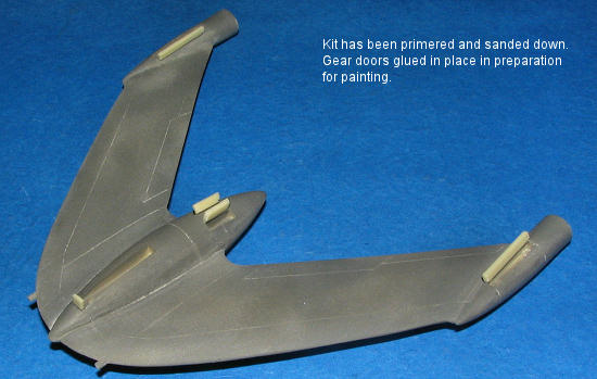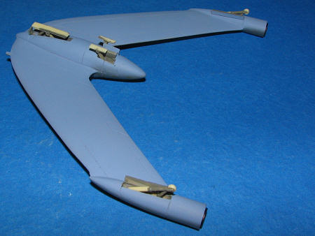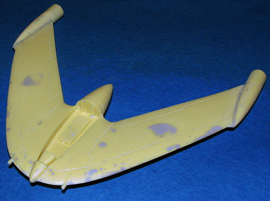 After sanding things down, I applied a couple of coats of Mr. Surfacer 500 and some standard filler for the big parts. Then the holes in the wingtip pods were drilled out (most were somewhat filled with resin) and the mating surfaces on the wing were cleaned up. The tabs on the wing tips are helpful, though both my tips had one missing/broken. The engine pods were then glued in place and the instrument panel was also attached. There was a considerable gap 'tween the tips and pods that needed more filler. Once the gaps were done, I sprayed the entire kit with Alclad II primer. This was then sanded down with 600 grit paper to get rid of the roughness that is standard with the Alclad primer. The interior was painted and the control wheel installed. Frankly, I doubt if a person laying on his stomach would be using a wheel to control flight! More than likely a short control stick. I did not use the pilot that was included, though it would have covered a plethora of ills in regards to a rather barren cockpit!