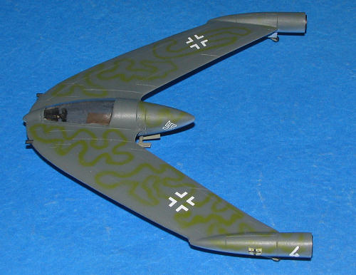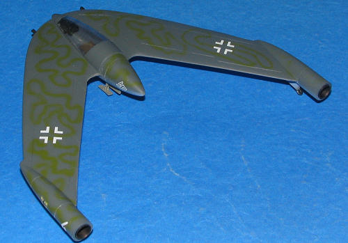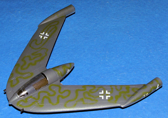 Luft '46 means just about anything goes in terms of colors and so it was with this one. I painted it RLM 88 blue on the underside (which looks suspiciously like Azure Blue) and RLM 75 on the upper surfaces. Then, I used RLM 91 (which looks a lot like US Interior Green) in a wave pattern on the top using my excellent Skybow 100 fine painting airbrush. This airbrush allowed me to go over each squiggly line a couple of time to increase the color saturation without getting it too wide.