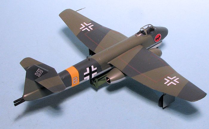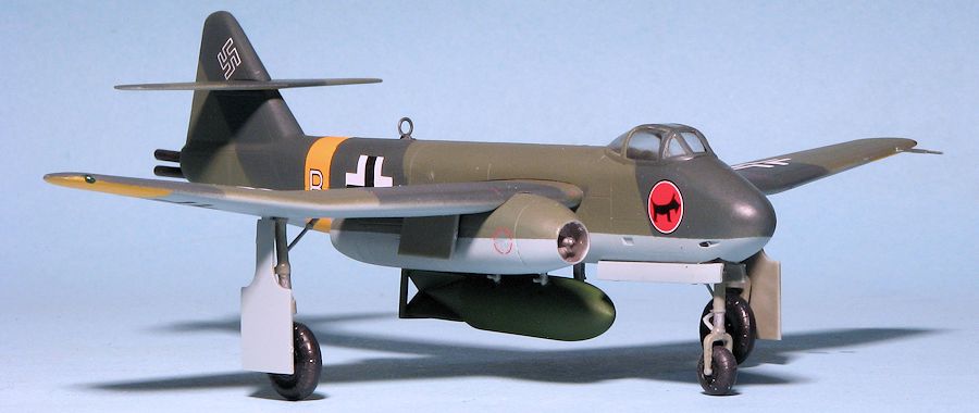 At this point, I gloss coated the model with Future and then applied the decals. I chose the box art plane as I liked the unit badge. The decals are superb and went on without any fuss. All of the small multi-colored data decals were badly off register so I used only minimal markings. Note that the wing walk decals are reversed with the long one going on the wing with the engine. I then attached all the rest of the various pieces like antennas, pitot tube, gear doors, rocket exhaust and the bomb. The bomb rack pieces were a bit of a problem as I had one go flying off to who knows where so replaced it with a sliver of plastic card. I then sprayed a coate of matte clear, removed the masks from the canopy and after a bit of touch up painting, that was it.