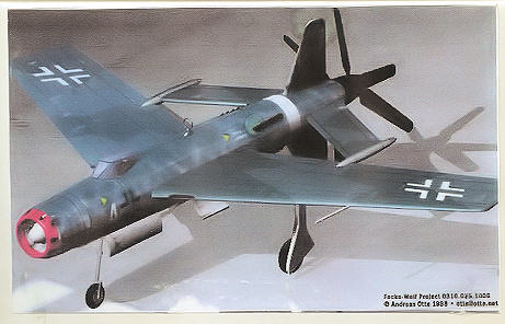 As with most Luftwaffe '46 project aircraft, only a smattering of information is available. This was a design based around the 4,000 hp Argus AS-413 engine and submitted as part of the RLM Specification 21-07-44. It was to be an all-weather high altitude fighter where the engine drove contra rotating props at the back of the fuselage. It had a rather unique swept forward tail plane assembly that attached to the rear of swept back wings. Like the Do-335, it would have had upper and lower vertical stabilizers and very stalky landing gear. Armament was all in the nose with 2 30mm and 2 20mm cannon. Projected top speed was 820 kph.