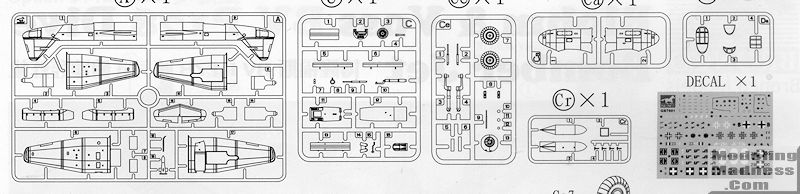 The wings are two upper and lower halves and there is some wheel well detail provided. Main gear is properly beefy with a separate oleo scissor and retraction strut. Same goes for the nose gear. The model can be built gear up and separate gear door sections are provided for that option.