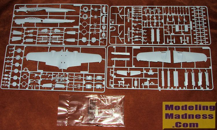 The kit included two hefty wing spars and the inner wing ribs are part of the fuselage halves as you will see these when the bomb bay is open. There is a nicely done engine nacelle assembly that consists of quite a few parts. It appears to be engineered so that later the early Do-17 could be kitted. The engine assembly includes the front cowling braces that I at first thought were pushrod assemblies until I noticed that the pushrods are molded on the engine. The kit's landing gear is very scale and I'd be surprised if the builder doesn't break the gear legs or retraction assembly when trying to remove them from the sprues; they are that thin. Of course, you can always build the plane gear up.