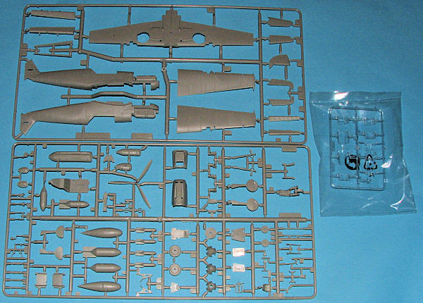 The cockpit is very nicely done with all the various bits one would expect and that includes sidewall detailing and parts. The seat has a molded in seat harness and Airfix provides a very nicely done three piece pilot in appropriate garb. An engine half is molded into each fuselage half and there are engine mounts to add to the detail. Cementing the upper cowling is an option, though I think most will do just that. Unlike all of Airfix's competitors, all of the flight control surfaces are separate. This includes the leading edge slats. The flaps have tabs to be in the normal down position, but by removing them you can position them up. Rudder and elevators are also separate to allow them to be more dynamically positioned. Two different upper cowlings are provided. A sand filter is provided for the desert markings.