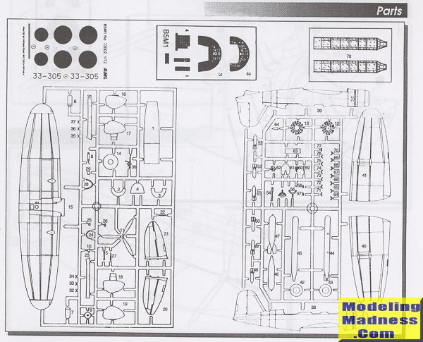 The interior is fairly well appointed with seats control sticks and bulkheads. There are what appear to be paper instruments to install should you wish to use them. The fuselage haves have no interior detail. A fairly nice engine is supplied with the pushrods molded in place, unlike their initial He-46 offering.