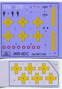 There were many different variants of the IAR-80 and a fighter bomber version, the IAR-81 was also produced in quantity. All of these aircraft varied in detail and armament from each other, making nearly confusing as different versions of the Bf-109! Try as I might, I can find no specific information on the IAR-80C. I have to assume that it is a pure fighter version as the kit does not tell you to add any bomb racks.