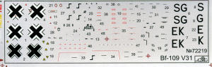 Two of the other three sprues are from other 109F kits, though one sprue has some of the radiator parts included that are not there on other boxings. The sprue for the v31 is all new and includes wings, tailplanes and rudder. The older sprues show some wear from having been used a lot while the newer sprue is cleaner. There are sink areas on some of the thick parts and some flash on the older sprues. Overall detailing is good, though somewhat soft compared to the products of more established companies like Hasegawa and Italeri.