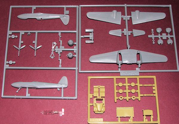 The upper guns are an insert that fits behind the cockpit. Each of the main gear legs is a single piece with a hefty mounting post. Separate main wheels and gear doors are included. There is no wheel well detail. The tail wheel is molded onto one fuselage half. There is no engine detail and little would be seen if there was. The one-piece props and spinners are nicely molded as is the one-piece canopy.
