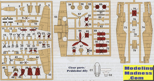 There is no photo etch, which I like and the kit does come with a fairly nicely done interior. This includes sidewalls, separate rudder pedals, the canon breech housing (there are two and it looks like you use the one for the 30mm), trim wheels, seat stick and an instrument panel on which you can put a decal if you desire. A gun sight is also included. You also get decals for the belts.