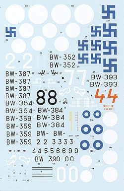 Markings are provided for no less than nine aircraft, ranging from the first deliveries in overall aluminum to post-war aircraft with the circular roundels. Included in the mix are the planes of aces Hans Wind, Ilmari Juutilianen, Eino Luukkanen, and Eero Kinnunen. Classic Airframes provides full color renditions on its website. The decals themselves are superbly printed with no detectable registration problems. White backgrounds to the insignia are provided separately to help alleviate possible registration issues.