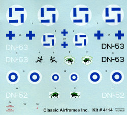 Markings are for three Finnish AF Do-17Zs. All are in the later olive green/black over light blue scheme with one of them overpainted in spots with white for winter ops. Two options are with the swastika insignia (done in parts, of course) and a third for the late 1944 roundel. These are well printed by Techmod.