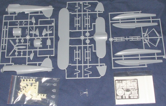 The kit is very much what one expects from a modern Classic Airframes kit. There are three sprues of well detailed injected plastic, two photo etched frets from Eduard, and two bags of very nicely done resin parts. Also included is an injection molded windscreen. All of the flight surfaces are a single piece so that will help speed assembly. There are small indentations showing where the wing struts are to be located. The fabric effect is properly subdued with only a hint to show the underlying framework.