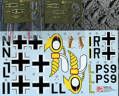 Markings are provided for two planes. One is the box art plane of 6./ZG 1 'Wespen' in Russia during 1942. the other is from 1(Z)./JG 77 in Norway during 1941. Both planes are in RLM 74/75/76 with lots of side mottling. Both have yellow lower wing tips with the Russian front plane having a yellow fuselage band as well. The decals are superbly printed by Cartograf in Italy. Seems like these folks have been getting a lot of work doing kit decals. They are great decals, but I've found in the past that they are somewhat resistant to weaker decal setting solutions. The large wasp head has been pre-cut to help it conform to the nose, but you many have to enhance those cuts a bit. You'll also have to scrounge swastikas from somewhere else as none appear to be included