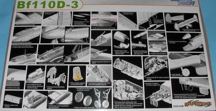The Bf-110D-3 and subject of this kit was a long-range Zerstörer with a lengthened tail for rescue dingy. Either two wing-mounted 300 L (80 US gal) or 900 L (240 US gal) drop tanks could be fitted. 500 kg (1,100 lb) ETC 500 was optional.