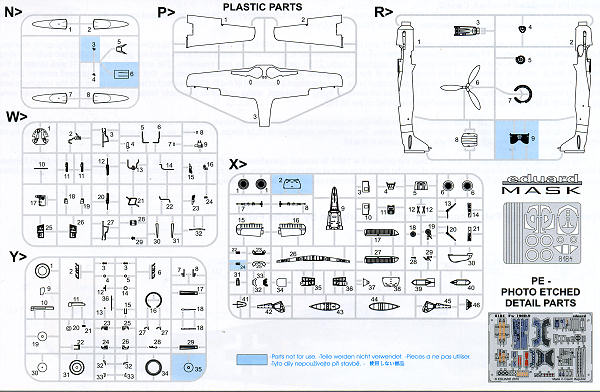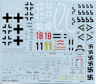 Apparently Eduard has listened to the complaints about not being able to build the kit with various panels closed as this one provides optional pieces to allow the builder to do just that. I have to applaud Eduard for making this change as there are those of us who don't like our models with all the panels opened. In addition to the usual sprues, this is a Profipack version so that mean a photo-etch sprue. In fact, the kit cannot be totally completed without the p.e. as this material is used for all the interior levers and the radio mast, to name a few items. This kit also breaks new ground by including an engine accessory unit that one can see when looking into the wheel wells. Previous 190D kit simply put in the usual blocking plate as came with the 190A.
