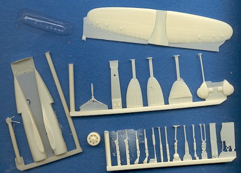 The castings themselves are really very well done. The parts are extremely well molded and for the most part, seem to be easy to remove from the casting sprues. A lot of them are on little 'handles' as you can see with some of these having more than one part on them. The bits are generally well formed and I found no instances of air bubbles or poor casting. Detail is quite good and engraved. A single vacuformed canopy is provided. Masking and cutting this will probably be one of the more difficult parts of the build.