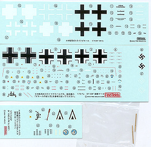 The instructions are in Japanese aside from a few color references (in Gunze and RLM). The markings provided are for an aircaft from II./JG 51 in December 1943. This aircraft, of Gruppe Kommander Karl Rammelt in in the standard RLM 74/75/76 with a white rudder, white lower wing tips, yellow lower cowling, and white tip to the spinner. The scheme shown on the box is not provided. There are three decal sheets; two of them are generic 109 while the third provides the specific markings. Swastikas are included. The white on the decals does appear to be a proper white and not ivory. There are also an abundant number of aftermarket decals for this plane if you should desire something different.