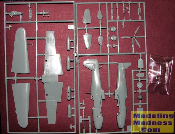 Before joining the fuselage halves, one installs a blanking plate above the ventral radiator section and attaches the prop onto the prop shaft. Once closed, a forward ventral radiator piece is installed. Wings consist of a complete lower section with the two upper pieces containing the control surfaces and the wing tips. Tail planes are one piece with the rudder molded onto one fuselage half. There is no wheel well detail. Gear is nicely done and the gear doors will need to be cut. The wheels are very plain, but then so were the real ones. Aftermarket are available (or have been in the past).