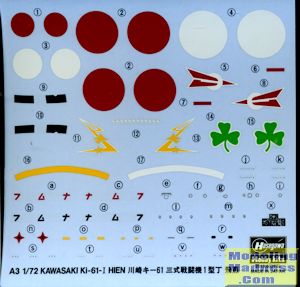 Markings are for two planes. One is the box art plane with the 244 Sentai with a large green shamrock. Note that this plane had the nose gun openings covered over. The other is with the 17th Sentai in the Philippines and is in overall unpainted metal with green squiggles on the upper surface. The decal sheet is new to this boxing and is up to modern standards. Note that the yellow wing leading edge ID stripes are not included as decals so will need to be painted in place as will the nose anti-glare area on the second option.