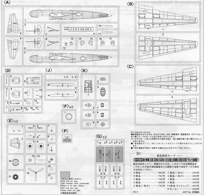 One has to decide which markings scheme is to be done about a third of the way through the build and there are notes showing which bits are appropriate for which markings option. The kit can be built with or without prop spinners, with the lower entrance hatch open or closed, with the upper cockpit hatch open or closed and with either a bomb or torpedo load. Apparently Nell did not have a standard bomb bay with doors so all loads are external of sorts. I found it interesting that the bomb load option is but two rather small looking bombs.
