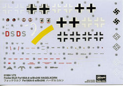 Markings are for several aircraft. The lone test aircraft was standard FW-190 with no distinguishing markings. So Hasegawa provided a 'what if' set of markings. This set is shown on the box art as being with KG 53 and has a black underside with yellow tail band and bomber codes. The decal sheet offers alternate styles of swastika for the fin and a couple of other unit badges that I could not immediately identify. It would have been nice to have the later 'blown' canopy provided as if this weapon would have been used late in the war by the 190, those airframes would have probably had the later canopy. The decal sheet is nicely printed and like most modern Hasegawa decal sheets should prove to have no issues.