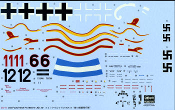 Instructions are excellent with the usual Gunze paint references. All the planes are in RLM 74/75/76 with mottling on the sides. Two are from JGr. 10 and have lower cowlings painted in yellow. The third option has the same snake fuselage markings but is listed as being with 8./JG 300 in 1945. This latter one has the blue/white/blue RVD band on the fuselage. All three have a white spinner spiral. The huge decal sheet is very nicely printed and includes a full stencil suite as well as red trim tab warning labels, a nice touch.