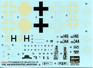 Instructions are superbly done in Hasegawa's usual style. Gunze paint references, of course. Markings for three aircraft. One is the box art plane of Oblt. Kurt Bonow of Kommando Bonow in 1945. RLM 70 upper surface with RLM 76 undersides. Next is another of Bonow's planes from 1945. This time it is RLM 76 upper with RLM 75 mottling all over the upper surface. Underside is black. The final plane, and the one without the Naxos or the radar stuff, if Oblt. Erich Sommer's aircraft from Italy in March 1945. This one is in RLM 81/82 uppers in a splinter pattern with RLM 76 undersides. Allow me to be fussy and mention that the decals are the old style with off white whites that are a bit on the thick side and quite glossy. However, they are well printed and as long as you don't mind, they should work fine.