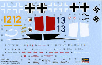 Instructions are the usual well done versions with Gunze references. I also noticed several small drawings to help with alignment and getting parts installed properly where they might be reversed. A nice touch. Markings are for two aircraft. The box art plane from 6.(Sturm)/JG 300 is yellow 12 and flown by UnterOffizier Paul Lixfeldt in late 1944. This one has an unpainted metal upper forward cowling and cowling ring. Standard RLM scheme of 74/75/76 on both of them. The other is the black nosed blue 13 of JG 300s Kommodore, Major Walther Dahl. This is a popular scheme that many will probably try to use. Interestingly, though the instructions say JG 300, the unit badge is JG 3 'Udet'. Dahl's plane has the cockpit armor where the other does not. Decals are very nicely done and include Lixfeldt's red fuselage band and Dahl's white. I'd paint them on myself.