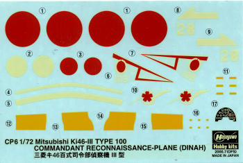 Instructions are typical for Hasegawa with well drawn construction sequences and Gunze paint references. Markings are supplied for three aircraft. First is a 15th Flight Regiment plane as shown on the box art It is painted a brownish upper surface color that you will have to mix with a green-grey underside. Similarly colored is a 6th Air Wing Headquarters Reconnaissance Squadron plane, while the third is Army Green on the upper surface and this one is from the 19th Company Independent Flight. All have yellow wing leading edge ID bands which are supplied on the sheet.