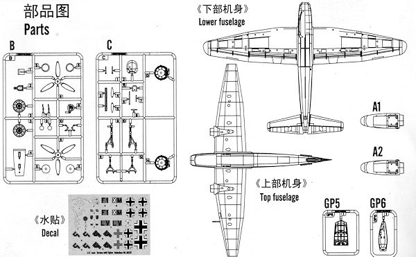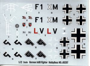 This kit depicts the Ju-88C. The Ju 88C was originally intended as a fighter-bomber and heavy fighter by adding fixed, forward-firing guns to the nose while retaining some bomb carrying ability of the A-series bomber. The C-series had a solid metal nose, and retained the A-series style vertical tail, while omitting the ventral Bola gondola under the crew compartment. It was later used as a night fighter and this became the main role of the Ju 88C.