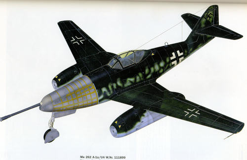 In January of 1945, Hitler and Goering held a meeting to discuss air armament. It was decided to fit the 50mm Mk 214 gun to the two aircraft. In mid February of 1945 the go-ahead was given and work was quickly undertaken in early March. Me-262A-1a, serial number 111899 was the first prototype. Messerschmitt's test pilot made 19 flights in this plane, firing many rounds at the ground and into the air during these flights. The plane was then turned over to JV-44 where it was flown by night fighter ace Major Wilhelm Herget. It was flown in two operational missions against US bomber formations on 16 April. On both occasions, the gun jammed.