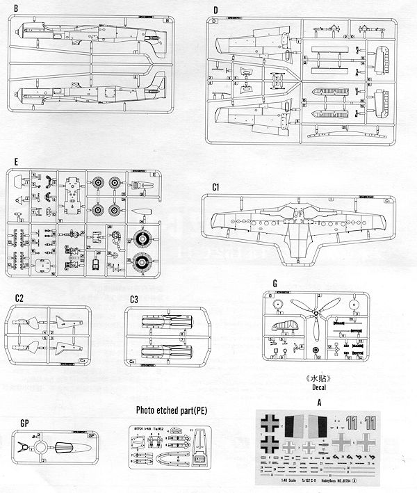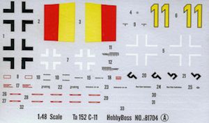 Markings are provided for one aircraft, a fictitious version with JG 301. The red and yellow fuselage bands are quite colorful and you can see why this unit was chosen. The aircraft is in RLM 81/82/76, but you can paint it any way you think would be reasonable. Hobby Boss has a full color painting and markings guide that offer colors in many brands of paints and also their RLM equivalents. Decals are very well done and my experience with them has always been positive.