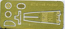 Now I am not all that well versed on the 190D, but I do know that most previous kits were lambasted for not having a visible engine accessory section and this one has that feature. I am going to go out on a limb and assume they have taken care of the fuss made over the main landing gear on the Tamiya kit as well. Cockpit is nicely appointed with seat, rudder pedals, instrument panel (with decal) and control stick. The design of the kit is such that one has to install the exhaust prior to closing the fuselage halves which is easy, but makes it difficult to paint them unless one paints the fuselage around them first before installing pre-painted exhausts. The kit comes with just the 'blown' canopy so you will need to keep that in mind if using aftermarket decals. The windscreen and canopy are separate to display the cockpit. Really, only a seat harness is actually needed to help in this area as the 190 cockpit is quite small. There are separate wing gun barrels that fit through the wheel wells and will need to be installed prior to installing the separate wells and closing up the wings. You can attach outer wing bomb racks if you wish and a centerline rack is provided. This can be equipped with either a bomb or a late drop tank.