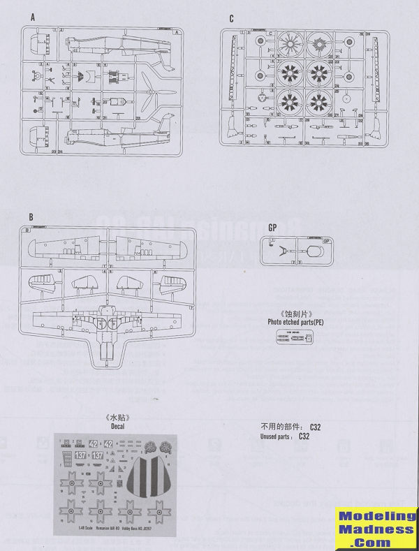 Instructions are nicely drawn with minimal color information. Markings are for two near identical airplanes. Both are in green/brown/light blue with yellow engine cowling, rear fuselage band and lower wing tips. Decals are nicely printed, but to my eye the yellow is too light and the blue on the rudder stripes is nearly black. Please note that I darkened the decal image so you could at least see there are white markings on it. I would recommend painting the rudder. There used to be aftermarket decals for this version, but everywhere I've looked they are sold out.
