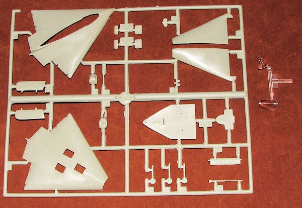 This is one of their earlier kits in that it did not come in a box. It is not one of their earliest kits, which were a soft, white plastic, but one a bit later in the greyish plastic that is a bit harder. There are ejector pin marks on just about every part and the sprue attachment point continues a small distance onto the surface of the part itself in many instances. This is a very simple kit that consists of a single grey plastic sprue and one that is clear.