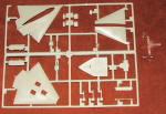 The fuselage/tail is two parts with the wing assembly also being two. There is a slab interior with a bulkhead. Other interior bits consist of a seat that sits on a pedestal, rudder pedals and control stick. The instrument panel is blank and one uses a decal for instruments. No sidewalls. There are also no real wheel wells with the bottom of the interior floor having holes to accept the three gear legs. Each gear leg has the wheel molded in place. The gear doors will need to have the ejector pin sanded off prior to use. A long probe is included for the nose. Ailerons and the rudder are separate pieces.