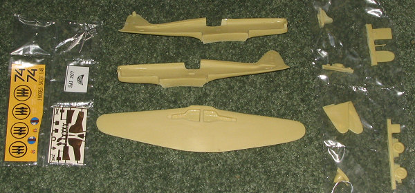 The main parts (fuselage halves and one-piece wings) are floating around in the box while the other bits are all in compartmentalized bags. The resin is fairly well done, though suffers from some mold flaws like pin-holes, incompletely molded bits and some large flow crud that is on the inside of the fuselage halves. Some of this is of no consequence and other bits will need ground away or sanded to build the kit. The top of one fin is quite poorly molded and will undoubtedly be replaced by card or epoxy filler.