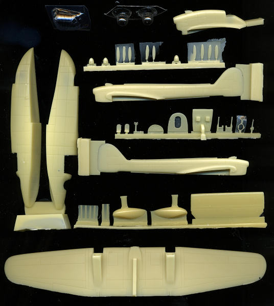 The cockpit is nicely appointed with a floor, two seats, two control sticks, instrument panel and a rear bulkhead. Both the fore and aft machine gun turrets are included as is the Scarff ring upper aft engine nacelle gun. The vac plastic for the canopy and turrets is well done and you can actually see the frame lines (unlike some other vac products I've used). Miniwings thoughtfully provides spares for these and I appreciate that. All three spinners are drilled for the blades and these are well done. Unfortunately, somewhere between production and bagging, one of my blades went missing.