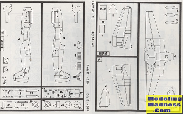 Instructions are well drawn and quite usable with detail drawings to help with some parts placement. All the color info is provided on one sheet with RLM references. These planes were RLM 70/71/65 in a splinter pattern. There were three fake squadrons photographed and the nose markings for all three as well as aircraft numbers are provided on the decal sheet.