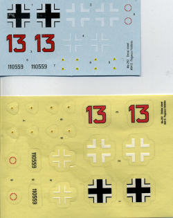 Instructions are very well drawn and clearly show where all the bits go. There is no painting information in the construction process. Markings are provided as both standard water slide decals and as stickers. They are for Heinz Bar's plane and instructions would have you paint it RLM 81/83 on the upper surfaces with RLM 78 on the underside. Clearly this last is a glitch and it should be RLM 76. The decals are well printed and, of course, are lacking a swastika. A note suggests painting the interior RLM 02 (it should be RLM 66) and the instrument panel flat black (it should also be RLM 66).