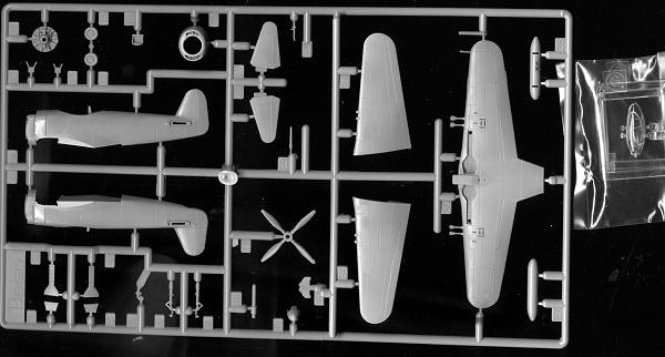 While there is no pilot, the aircraft has a nice, deep interior with an instrument panel, seat and control stick. A fairly nice representation of the front cylinder bank is provided for the cowling and the kit comes with a fuselage drop tank. Equally nice is the landing gear and the gear wells are properly deep. A one-piece canopy is provided. The general engraved detail is crisply done and appropriate for the scale.
