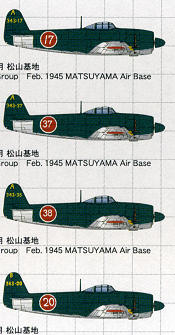 All of these are in Kawanishi Navy Green over unpainted metal with yellow leading edge ID stripes. These are all 343rd Flying Group aircraft with three of them (with the A tail code) being from the 301st Fighter Squadron. The other (with the B tail code) is with the 407th Fighter Squadron. These all have an aircraft number painted inside the fuselage roundel. Decals (not shown) are well printed and typical of Platz, you get enough insignia and data markings for three aircraft even though only two are provided in the box.