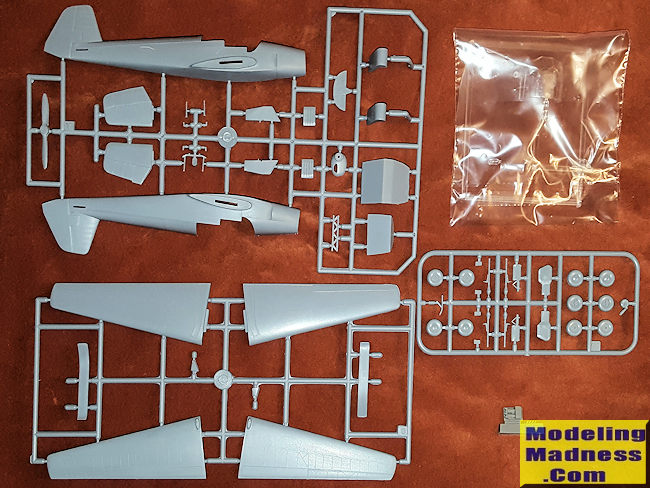 Cockpit clear bits are a full windscreen/canopy piece so you cannot pose it open without cutting. The rear quarter windows are molded into a fuselage section that fits behind this. There are two different wheel styles shown depending on which plane you are building. This is the only option shown. Actually, the landing gear leg piece shown for the Swiss option may be incorrect as photos of the extant plane in Switzerland's museum show different legs. Last steps are the installation of more photo etch bits and the prop.
