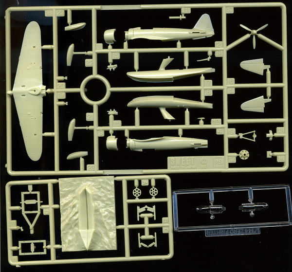 Molded in a cream colored plastic, the detail level is what we have come to expect from Sweet. The interior is pretty much just a seat with the antenna behind it. A fair representation of the motor is provided to place in the one piece cowling. The wing is a single piece with gun inserts. Each wing tip float is two pieces. The main float is two large sections with the rear bracing. One needs to put some weight in the forward portion of the float, though no amount is specified. To put under the wings are a pair of bombs. These already have the holes drilled for them in the lower wing so one will need to fill those if not using the bombs.
