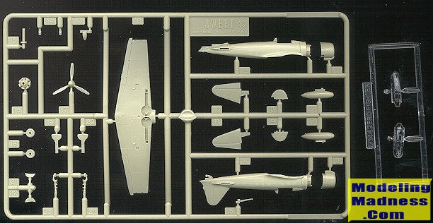 The Zero is the third aircraft that they have done, the Macchi C.200, Hurricane, and FM-2 preceding it. I'm frankly a bit amazed that they did not start with this kit as the home market for Zeros is nearly insatiable, but I'm very glad that they chose an early war aircraft. Several reasons. One is that I think the early A6Ms are the coolest of the lot. Secondly, they were flown by many of Japan's Naval aces at some time during their careers, and third because the overall green-grey camouflage is easy to paint! Sweet has made the best of this aircraft kit and has done a considerable number of boxings of this and later A6Ms. This one is a bit special as it includes a section of flight deck.